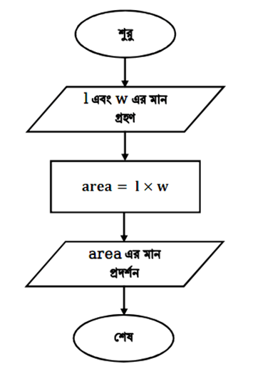 ধাপ-৩: area=l×w সমীকরণে l এবং w চলকের মান বসিয়ে area চলকের মান নির্নয় করি।