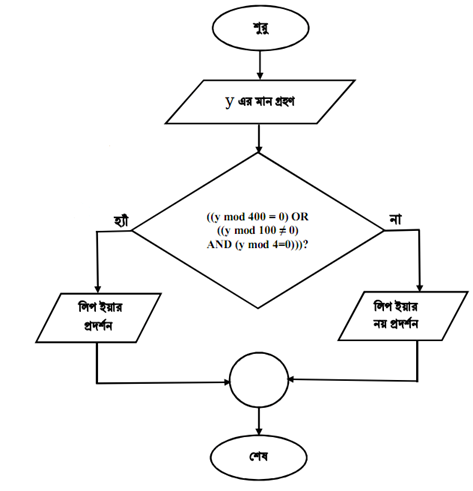 ধাপ-৩: যদি ((y mod 400 = 0) OR ((y mod 100 ≠ 0) AND (y mod 4 = 0))) হয়, তাহলে ৪নং ধাপে যাই, অন্যথায় ৫নং ধাপে যাই।
