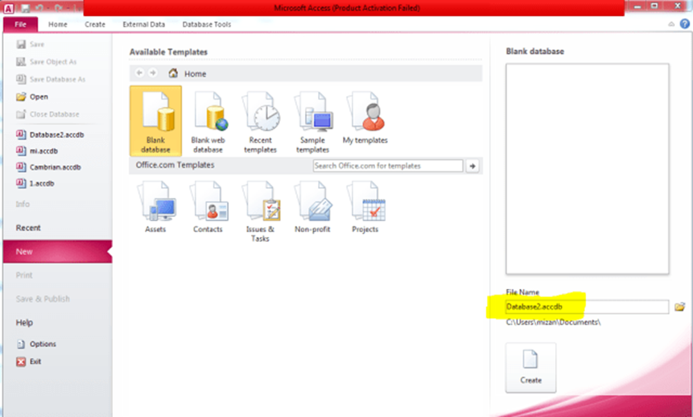 Database তৈরি করার জন্য DBMS হিসেবে Microsoft Access 2010 এর ব্যবহার দেখানো হল। প্রথমেই Microsoft Access 2010 অ্যাপ্লিকেশনটি ইন্সটল দিতে হবে। তারপর প্রোগ্রামটি রান করলে নিচের মত করে চিত্র প্রদর্শিত হবে।