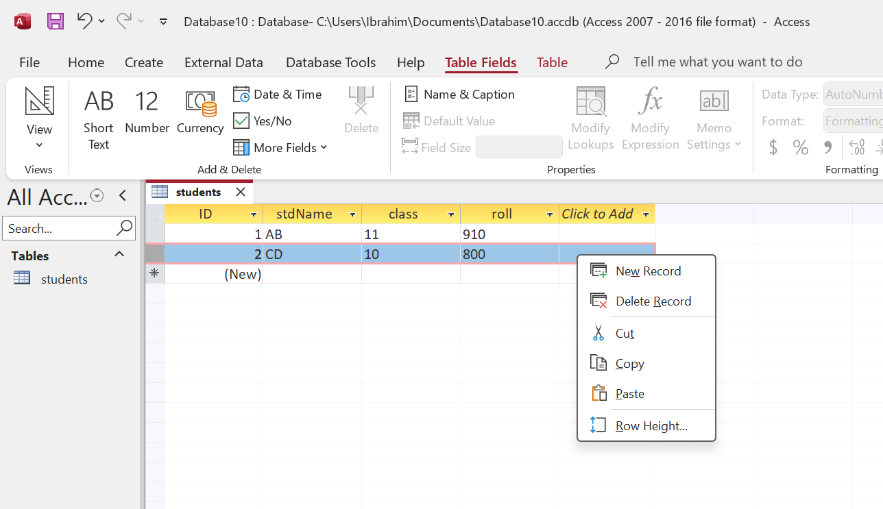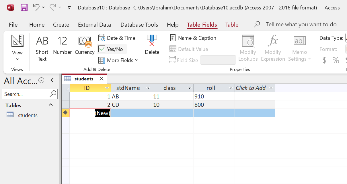 ৩. উপরের সারিতে ক্লিক করে ফিল্ডের নাম দেই (যেমন StudentID, Name, DOB, Class, Phone)।