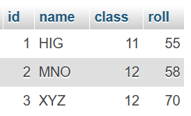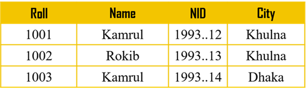 ডেটাবেজ টেবিলের রেকর্ড শনাক্তকরণ, অনুসন্ধান এবং ডেটাবেজের একাধিক টেবিলের মধ্যে সম্পর্ক স্থাপনের জন্য যে ফিল্ড ব্যবহার করা হয় তাকে বলা হয় কী ফিল্ড। কী ফিল্ডের ডেটাগুলো হবে অভিন্ন ও অদ্বিতীয়। নিচের টেবিলের “Roll” ফিল্ডটি কী ফিল্ড।