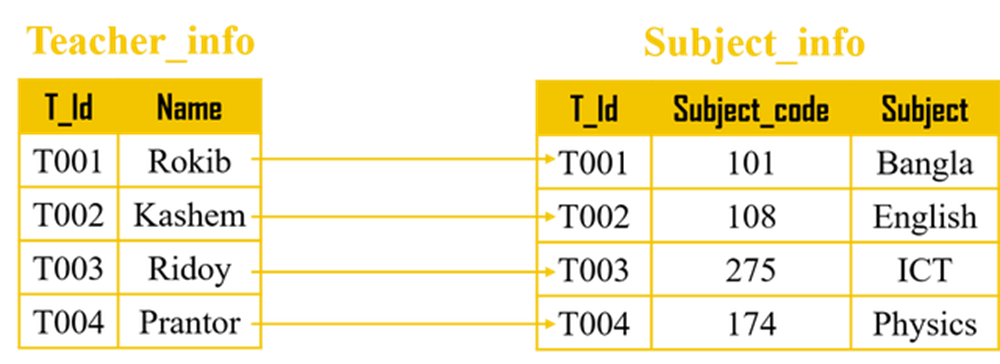 উপরের টেবিল থেকে দেখা যাচ্ছে, একজন শিক্ষক কেবলমাত্র একটি সাবজেক্ট এর ক্লাস নিচ্ছে। অর্থাৎ Teacher_info টেবিলের একটি রেকর্ডের সাথে Subject_info টেবিলের কেবলমাত্র একটি রেকর্ড সম্পর্কিত। তাই তাদের মধ্যে One to One রিলেশন বিদ্যমান।