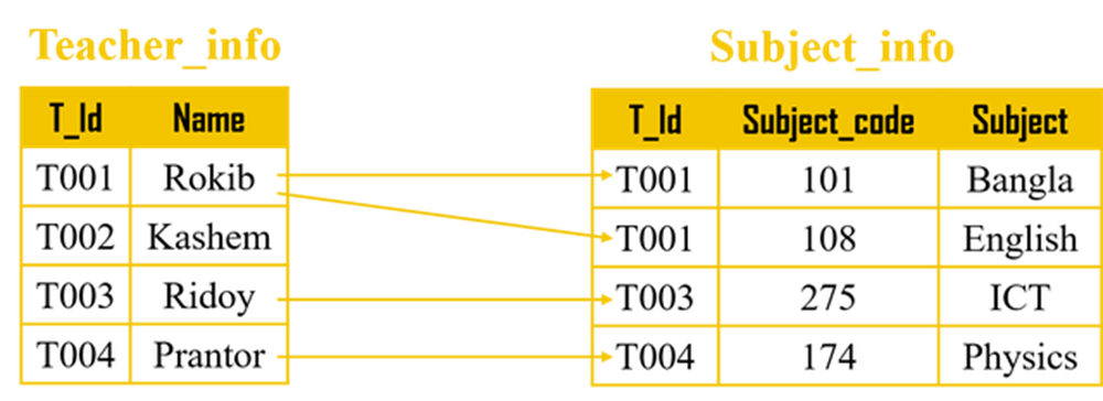উপরের টেবিল থেকে দেখা যাচ্ছে, একজন শিক্ষক একাধিক সাবজেক্ট এর ক্লাস নিচ্ছে। অর্থাৎ Teacher_info টেবিলের একটি রেকর্ডের সাথে Subject_info টেবিলের একাধিক রেকর্ড সম্পর্কিত। তাই তাদের মধ্যে One to many রিলেশন বিদ্যমান।