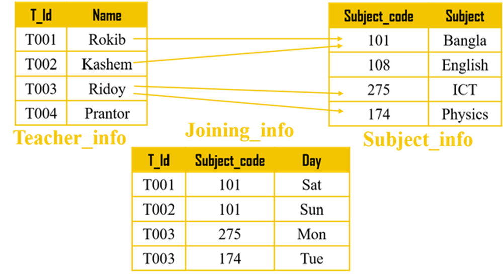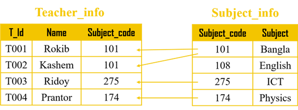 উপরের টেবিল থেকে দেখা যাচ্ছে, একাধিক শিক্ষক একটি সাবজেক্ট এর ক্লাস নিচ্ছে। অর্থাৎ Teacher_info টেবিলের একাধিক রেকর্ডের সাথে Subject_info টেবিলের একটি রেকর্ড সম্পর্কিত। তাই তাদের মধ্যে Many to One রিলেশন বিদ্যমান।