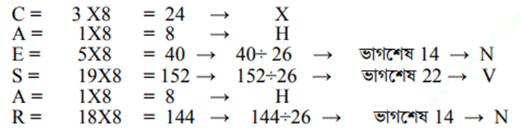 ৪। গুণফল ২৬ অপেক্ষা বড় হলে গুণফলকে ২৬ দ্বারা ভাগ করে ভাগশেষ নির্ণয় করা হয়। এক্ষেত্রে ভাগশেষের মানকে অবস্থান ধরে বর্ণমালার ক্রমানুসারে যে বর্ণটি পাওয়া যায় তা এনক্রিপ্টেড বর্ণ হিসাবে ধরা হয়।