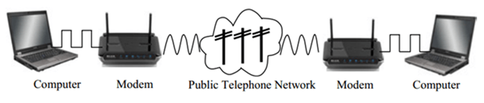 উৎস কম্পিউটারের সাথে যুক্ত মডেম কম্পিউটারের ডিজিটাল সিগন্যালকে অ্যানালগ সিগন্যালে রূপান্তর করে টেলিফোন যোগাযোগ ব্যবস্থা দ্বারা গ্রাহকের নিকট ডেটা বা তথ্য প্রেরণ করে। এভাবে টেলিফোন লাইনের উপযোগী করে ডিজিটাল সিগন্যালকে অ্যানালগ সিগন্যালে পরিবর্তনের প্রক্রিয়াকে মডুলেশন বলে।