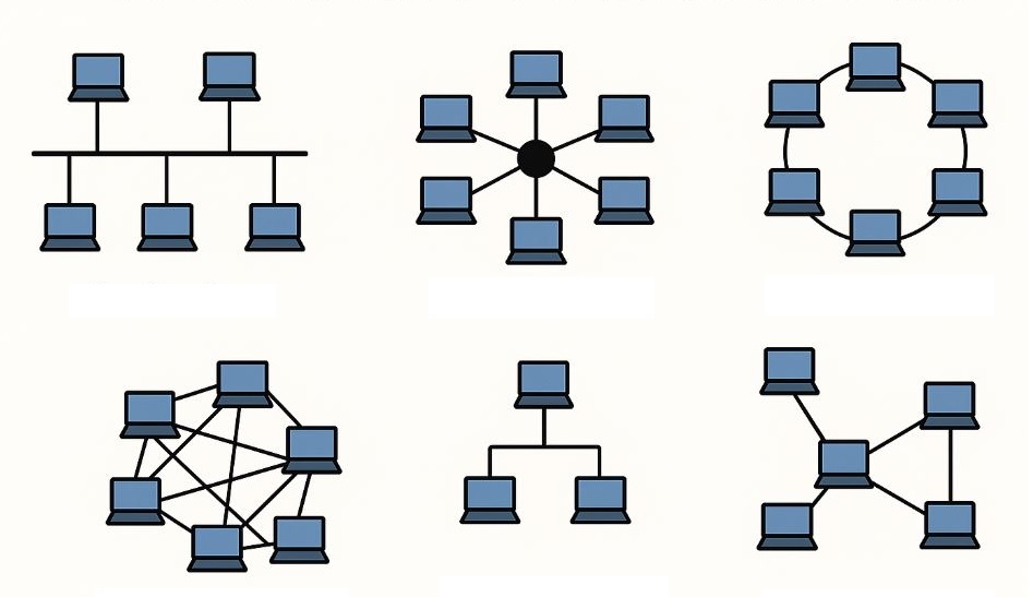 কম্পিউটার নেটওয়ার্কে নিম্ন বর্ণিত ছয় ধরণের টপোলজি থাকে। যথা –