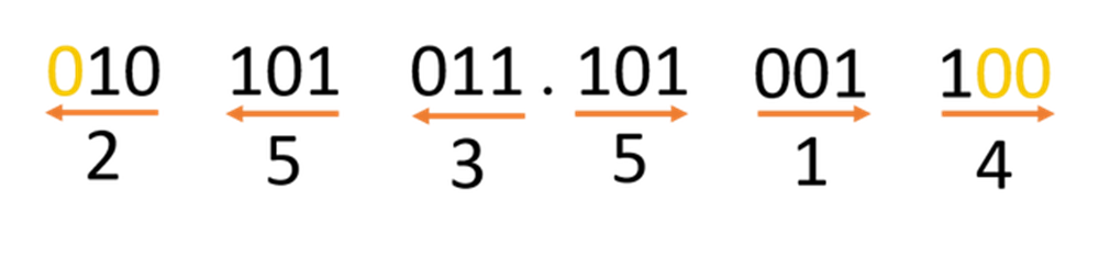 ধাপ-১ঃ পূর্ণ সংখ্যার ক্ষেত্রে বাইনারি সংখ্যাটির ডান থেকে বাম দিকে ৩-বিট করে গ্রুপ করে নিতে হবে এবং ভগ্নাংশের ক্ষেত্রে বাম থেকে ডান দিকে ৩-বিট করে গ্রুপ করতে হবে ।