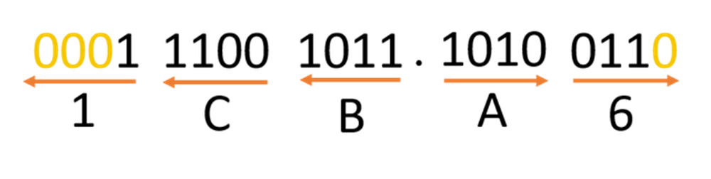 ধাপ-১ঃ পূর্ণ সংখ্যার ক্ষেত্রে সংখ্যাটির ডান থেকে বাম দিকে ৪-বিট করে গ্রুপ করে নিতে হবে এবং ভগ্নাংশের ক্ষেত্রে বাম থেকে ডান দিকে ৪-বিট করে গ্রুপ করতে হবে ।