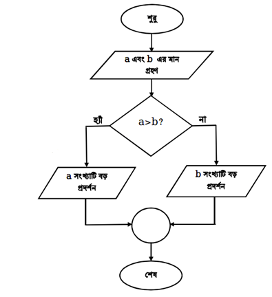 ধাপ-৩: যদি (a>b) হয়, তাহলে a সংখ্যাটি বড় প্রদর্শন করি এবং ৫নং ধাপে যাই, অন্যথায় ৪নং ধাপে যাই।