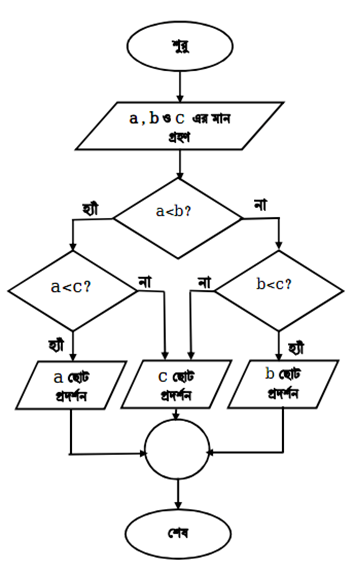 ধাপ-৫: যদি b<c হয়, তাহলে b ছোট প্রদর্শন করি, অন্যথায় c ছোট প্রদর্শন করি।