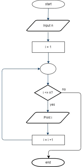 প্রোগ্রাম #include<stdio.h> int main() { int i, n; printf("Enter the value of n: "); scanf("%d",&n); for(i=1; i<=n; i++) { printf("%d ",i); } return 0;